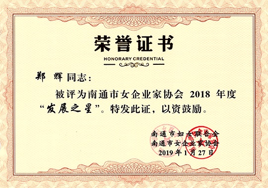 南通三圣集團(tuán)副董事長鄭輝女士被南通市婦女聯(lián)合會(huì)、南通市女企業(yè)家協(xié)會(huì)評(píng)為2018年度“發(fā)展之星”,全南通市僅有8位女企業(yè)家獲此殊榮。