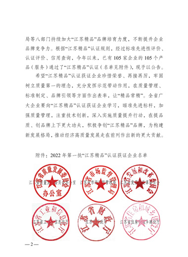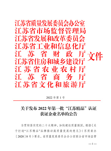 “江蘇精品”是江蘇省為推動(dòng)形成一批自主創(chuàng)新、品質(zhì)高端、服務(wù)優(yōu)質(zhì)、信譽(yù)過硬、市場(chǎng)公認(rèn)的“江蘇精品”品牌群體,以行業(yè)龍頭骨干、“專精特新”和“單項(xiàng)冠軍”等企業(yè)為主體認(rèn)證對(duì)象,參照國(guó)際慣例、運(yùn)用市場(chǎng)機(jī)制,由江蘇省市場(chǎng)監(jiān)管局會(huì)同省發(fā)改委等七部門開展的重點(diǎn)認(rèn)證工作。