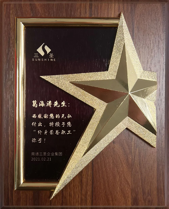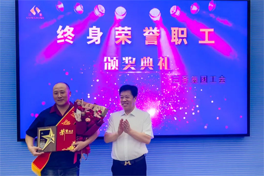 三圣奮斗史中閃耀著這樣一顆璀璨之星,他以堅定的信念和不懈的努力,登上榮譽(yù)巔峰,成為開發(fā)區(qū)當(dāng)之無愧的一名“金牌員工”,并被三圣集團(tuán)董事會、三圣工會授予“終身榮譽(yù)職工”的光榮稱號。