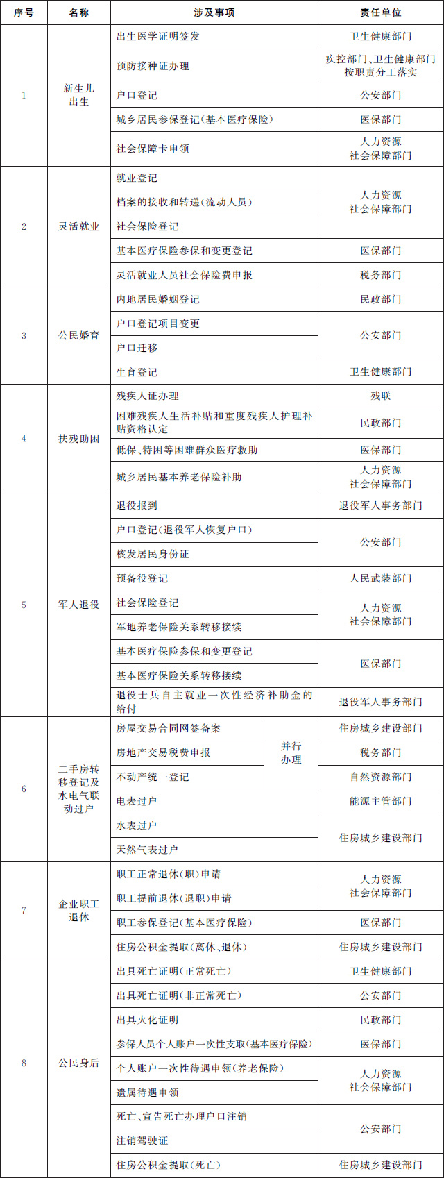 (二)推進(jìn)個(gè)人全生命周期相關(guān)政務(wù)服務(wù)事項(xiàng)“一件事一次辦”。圍繞個(gè)人從出生到身后全生命周期的重要階段,梳理集成同一階段內(nèi)需要辦理的多個(gè)單一政務(wù)服務(wù)事項(xiàng),為群眾提供新生兒出生、入園入學(xué)、大中專(zhuān)學(xué)生畢業(yè)、就業(yè)、就醫(yī)、婚育、扶殘助困、軍人退役、二手房交易及水電氣聯(lián)動(dòng)過(guò)戶(hù)、退休、身后等集成化辦理服務(wù),切實(shí)提升群眾辦事便捷度,減少跑動(dòng)次數(shù)。