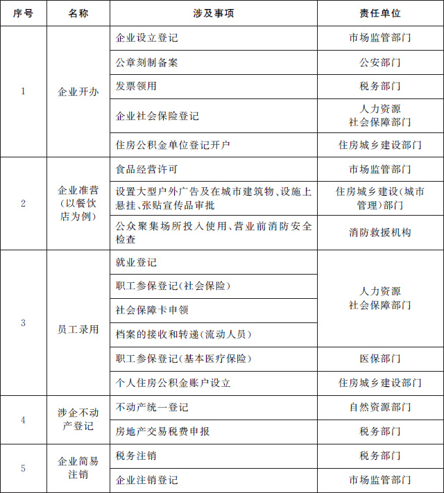 (一)推進(jìn)企業(yè)全生命周期相關(guān)政務(wù)服務(wù)事項(xiàng)“一件事一次辦”。圍繞企業(yè)從開(kāi)辦到注銷(xiāo)全生命周期的重要階段,梳理集成同一階段內(nèi)需要到政府部門(mén)、公用企事業(yè)單位和服務(wù)機(jī)構(gòu)辦理的多個(gè)單一政務(wù)服務(wù)事項(xiàng),為企業(yè)提供開(kāi)辦、工程建設(shè)、生產(chǎn)經(jīng)營(yíng)、惠企政策兌現(xiàn)、員工錄用、不動(dòng)產(chǎn)登記、注銷(xiāo)等集成化辦理服務(wù),提高辦事效率,降低辦事成本。