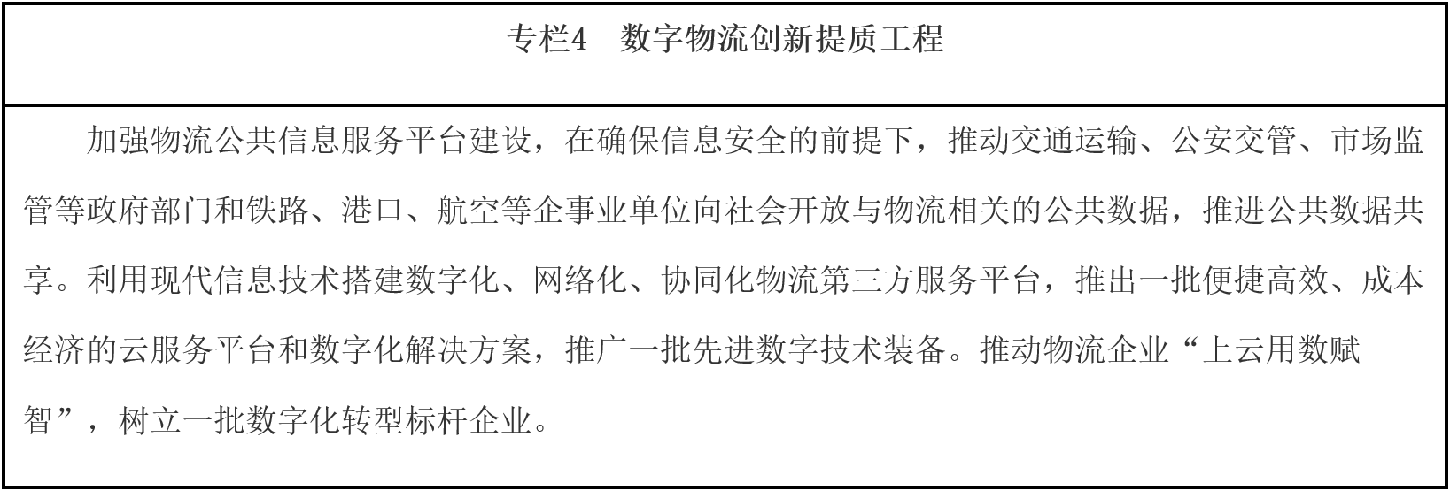 ——物流創(chuàng)新發(fā)展能力和企業(yè)競爭力顯著增強。物流數(shù)字化轉(zhuǎn)型取得顯著成效,智慧物流應用場景更加豐富。物流科技創(chuàng)新能力不斷增強,產(chǎn)學研結(jié)合機制進一步完善,建設一批現(xiàn)代物流科創(chuàng)中心和國家工程研究中心。鐵路、民航等領域體制改革取得顯著成效,市場活力明顯增強,形成一批具有較強國際競爭力的骨干物流企業(yè)和知名服務品牌。