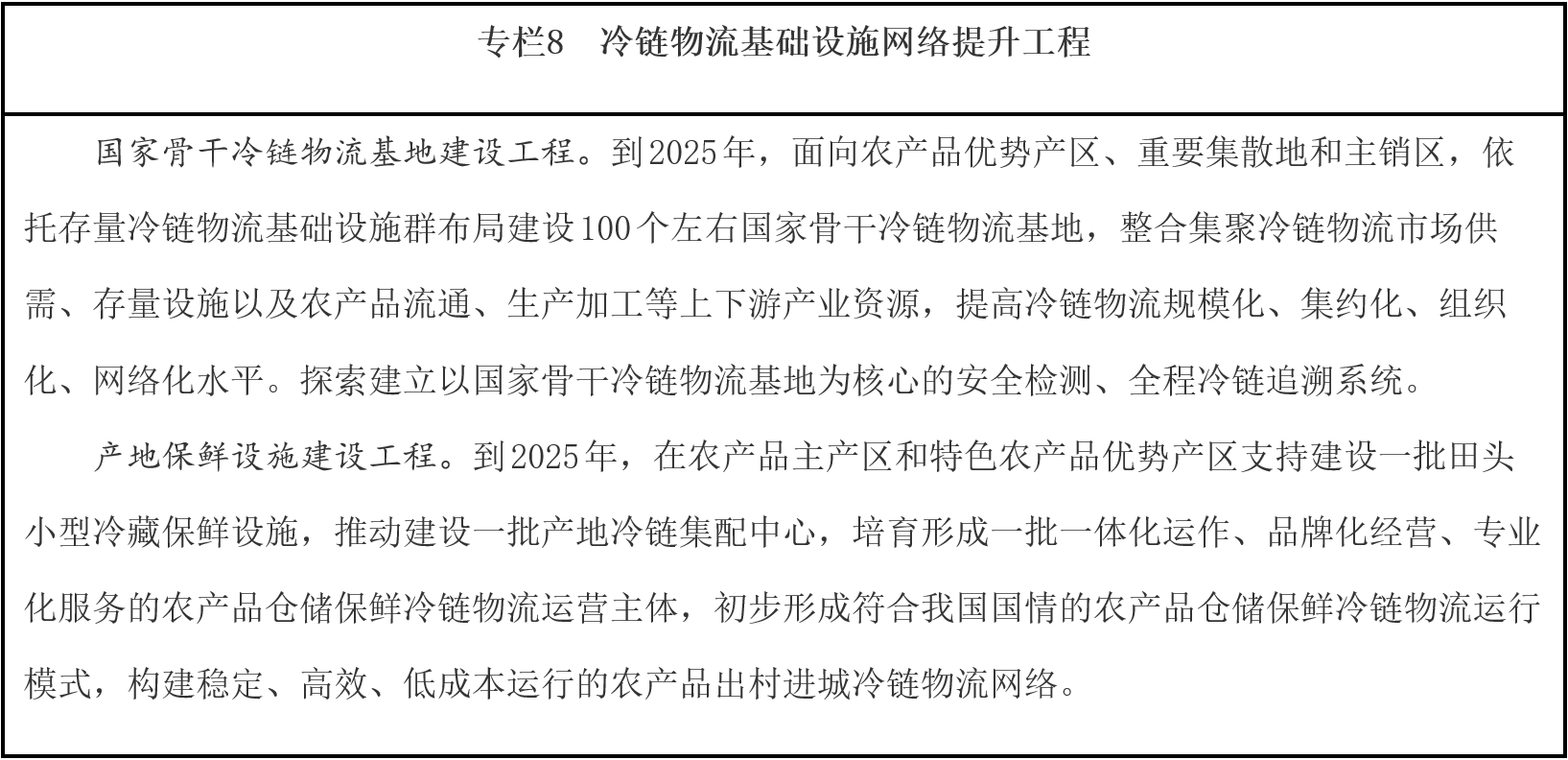 提高冷鏈物流質(zhì)量效率。大力發(fā)展鐵路冷鏈運輸和集裝箱公鐵水聯(lián)運,對接主要農(nóng)產(chǎn)品產(chǎn)區(qū)和集散地,創(chuàng)新冷鏈物流干支銜接模式。發(fā)展“生鮮電商+產(chǎn)地直發(fā)”等冷鏈物流新業(yè)態(tài)新模式。推廣蓄冷箱、保溫箱等單元化冷鏈載器具和標準化冷藏車,促進冷鏈物流信息互聯(lián)互通,提高冷鏈物流規(guī)?;藴驶?。依托國家骨干冷鏈物流基地、產(chǎn)銷冷鏈集配中心等大型冷鏈物流設施,加強生鮮農(nóng)產(chǎn)品檢驗檢疫、農(nóng)獸藥殘留及防腐劑、保鮮劑、添加劑合規(guī)使用等質(zhì)量監(jiān)管。研究推廣應用冷鏈道路運輸電子運單,加強產(chǎn)品溯源和全程溫濕度監(jiān)控,將源頭至終端的冷鏈物流全鏈條納入監(jiān)管范圍,提升冷鏈物流質(zhì)量保障水平。健全進口冷鏈食品檢驗檢疫制度,筑牢疫情外防輸入防線。