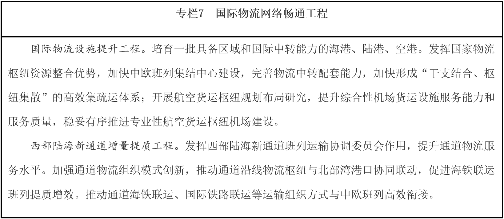 發(fā)展物流通道經(jīng)濟。圍繞共建“一帶一路”、長江經(jīng)濟帶發(fā)展等重大戰(zhàn)略實施和西部陸海新通道建設,提升“四橫五縱、兩沿十廊”物流大通道沿線物流基礎設施支撐和服務能力,密切通道經(jīng)濟聯(lián)系,優(yōu)化通道沿線產(chǎn)業(yè)布局與分工合作體系,提高產(chǎn)業(yè)組織和要素配置能力。