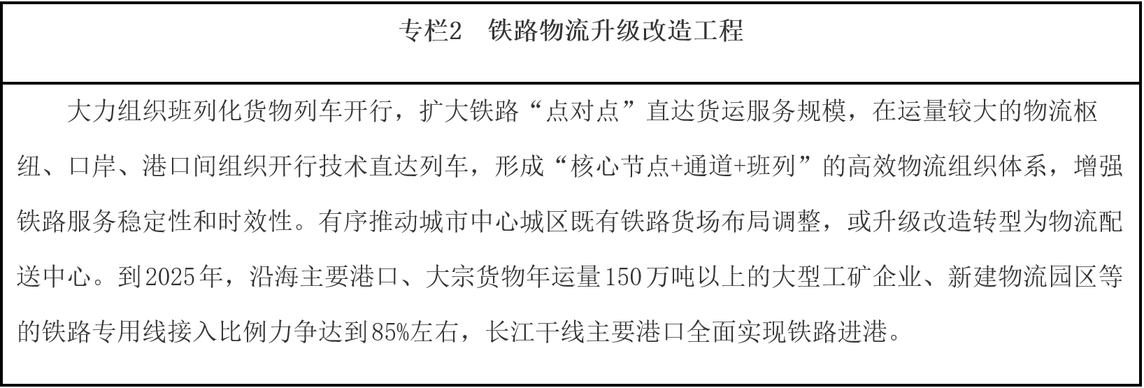 推進結(jié)構(gòu)性降成本。加快推進鐵路專用線進港區(qū)、連園區(qū)、接廠區(qū),合理有序推進大宗商品等中長距離運輸“公轉(zhuǎn)鐵”、“公轉(zhuǎn)水”。完善集裝箱公鐵聯(lián)運銜接設施,鼓勵發(fā)展集拼集運、模塊化運輸、“散改集”等組織模式,發(fā)揮鐵路干線運輸成本低和公路網(wǎng)絡靈活優(yōu)勢,培育有競爭力的“門到門”公鐵聯(lián)運服務模式,降低公鐵聯(lián)運全程物流成本。統(tǒng)籌沿海港口綜合利用,提升大型港口基礎設施服務能力,提高碼頭現(xiàn)代化專業(yè)化規(guī)?;?,加快推進鐵水聯(lián)運銜接場站改造,提高港口鐵路專用線集疏網(wǎng)絡效能,優(yōu)化作業(yè)流程。完善內(nèi)河水運網(wǎng)絡,統(tǒng)籌江海直達、江海聯(lián)運發(fā)展,發(fā)揮近海航線、長江水道、珠江水道等水運效能,穩(wěn)步推進貨物運輸“公轉(zhuǎn)水”。推進鐵水聯(lián)運業(yè)務單證電子化,促進鐵路、港口信息互聯(lián),實現(xiàn)鐵路現(xiàn)車、裝卸車、貨物在途、到達預確報以及港口裝卸、貨物堆存、船舶進出港、船期艙位預定等鐵水聯(lián)運信息交換共享。支持港口、鐵路場站加快完善集疏運油氣管網(wǎng),有效對接石化等產(chǎn)業(yè)布局,提高管道運輸比例。