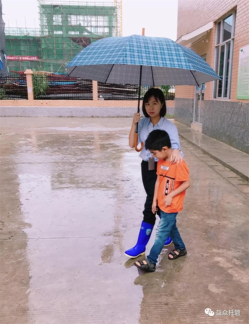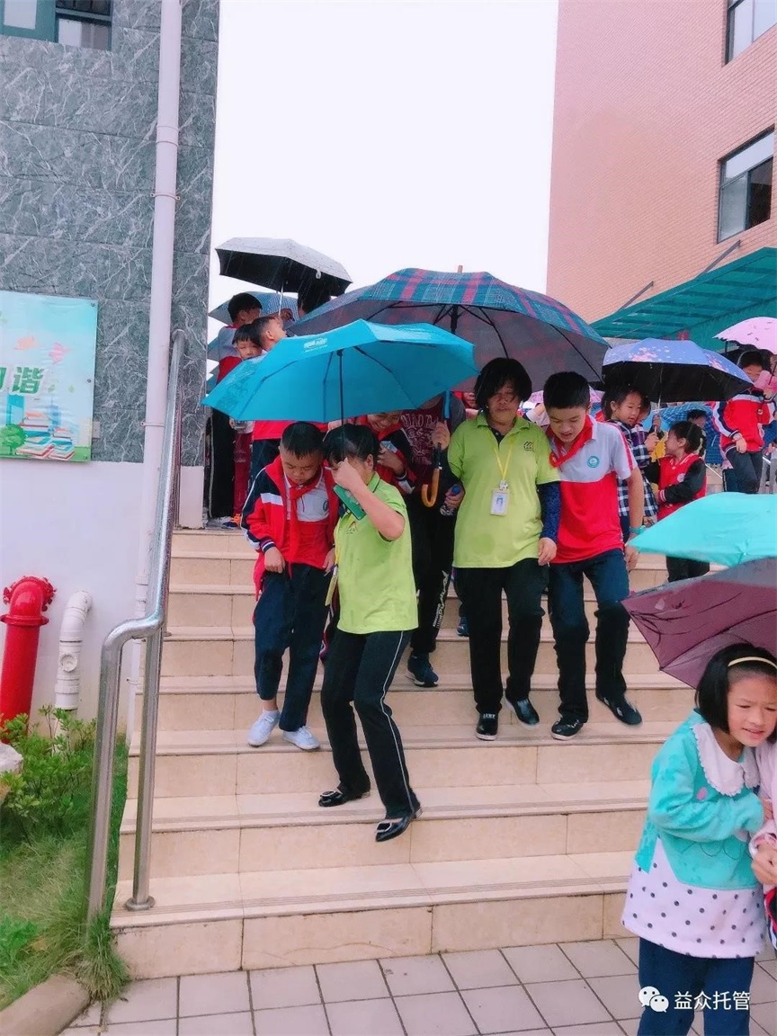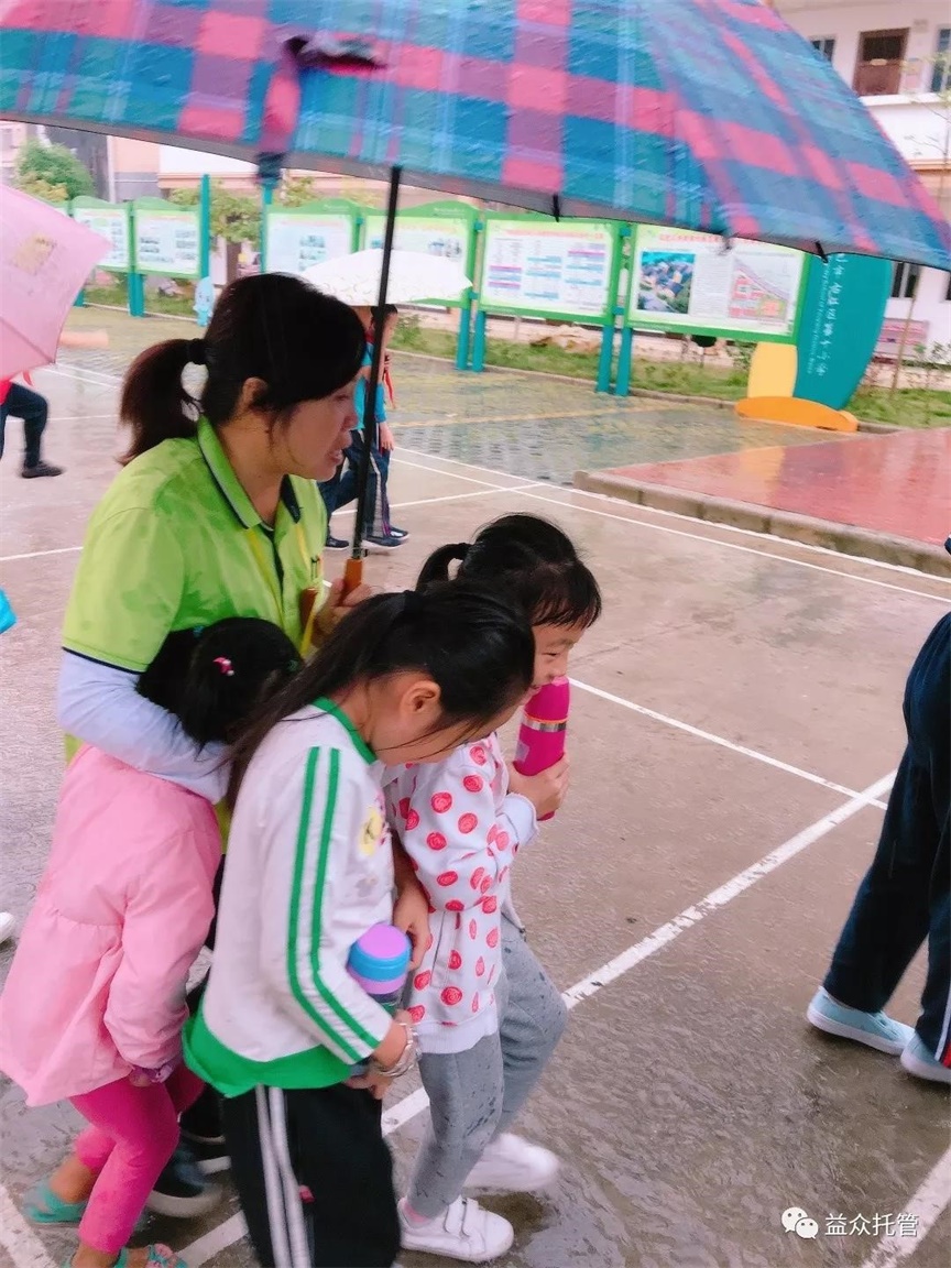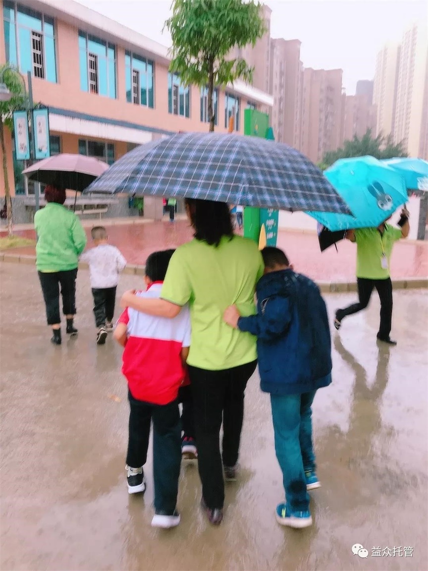 ??? 突如其來(lái)的大雨讓孩子們寸步難行,公司各校區(qū)第一時(shí)間啟動(dòng)雨天動(dòng)線方案。托管老師們撐起雨傘,從教室門口到食堂為孩子們構(gòu)筑了一條無(wú)雨通道,護(hù)送孩子們到食堂用餐,保障下雨期間的學(xué)生人身安全。