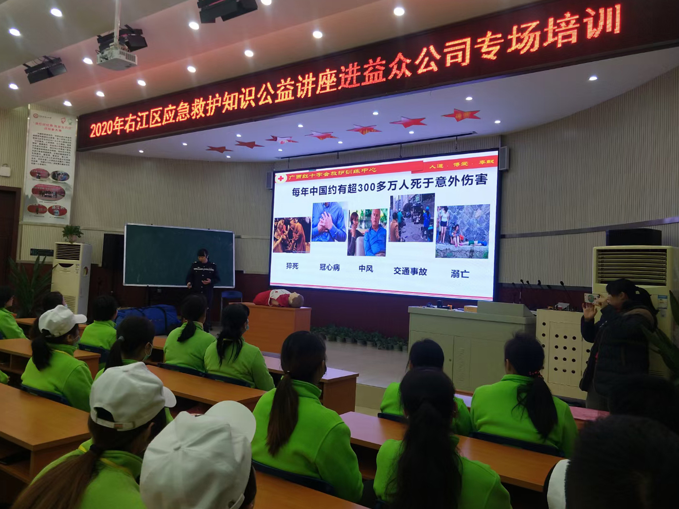 ????????為普及應(yīng)急救護(hù)知識(shí),提高員工安全防范意識(shí)、自救互救能力和應(yīng)急救護(hù)技能,12月2日、6日,益眾公司邀請(qǐng)百色市右江區(qū)紅十字會(huì)到公司開展急救知識(shí)技能培訓(xùn),公司百余名管理人員、有關(guān)直屬班組400余人參加培訓(xùn)。