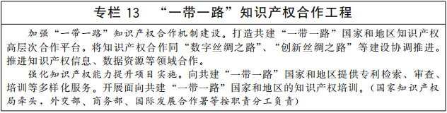 加強知識產(chǎn)權(quán)國際合作機制建設(shè)。鞏固和完善“一帶一路”知識產(chǎn)權(quán)合作,充分利用“一帶一路”知識產(chǎn)權(quán)合作平臺,擴大合作項目規(guī)模和儲備。深度參與金磚國家、中美歐日韓、中日韓、中國—東盟等小多邊知識產(chǎn)權(quán)合作,加強與各方政策和業(yè)務(wù)規(guī)則交流,支持產(chǎn)業(yè)界積極參與相關(guān)合作機制。完善跨境司法協(xié)作安排,加強防范打擊侵犯知識產(chǎn)權(quán)犯罪國際合作。(中央宣傳部、最高人民法院、最高人民檢察院、外交部、公安部、商務(wù)部、海關(guān)總署、國家知識產(chǎn)權(quán)局等按職責(zé)分工負(fù)責(zé))