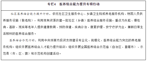 增加醫(yī)養(yǎng)結(jié)合服務(wù)供給。實(shí)施社區(qū)醫(yī)養(yǎng)結(jié)合能力提升行動(dòng)。積極開展基本公共衛(wèi)生服務(wù)老年健康與醫(yī)養(yǎng)結(jié)合服務(wù)項(xiàng)目。支持優(yōu)撫醫(yī)院、光榮院轉(zhuǎn)型,開展醫(yī)養(yǎng)結(jié)合服務(wù)。推動(dòng)社區(qū)衛(wèi)生服務(wù)中心與社區(qū)養(yǎng)老服務(wù)機(jī)構(gòu)、鄉(xiāng)鎮(zhèn)衛(wèi)生院與特困人員供養(yǎng)服務(wù)設(shè)施(敬老院)、村衛(wèi)生室與農(nóng)村幸福院毗鄰建設(shè),采取多種有效方式實(shí)現(xiàn)資源整合、服務(wù)銜接。
